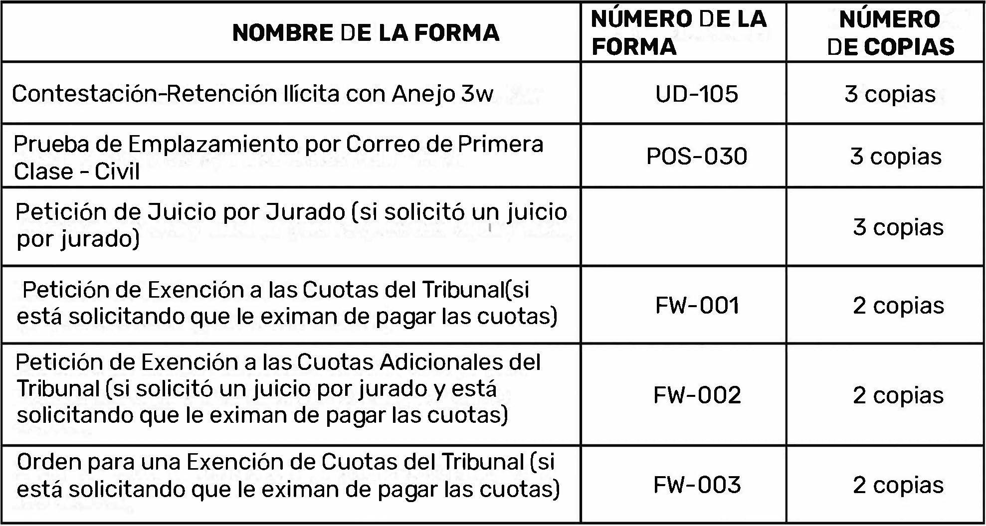 - EXENCIÓN DE CUOTAS: La mayoría de los inquilinos que usan la Herramienta, aunque no todos, van a ser exentos de pagar las cuotas del tribunal. Cuando le entrega al Secretario las formas FW-001 y FW-002, le está solicitando oficialmente al tribunal que no le cobren dinero por radicar su documentación. El secretario o el juez usará la forma FW-003 para decidir si usted califica o no para la exención. Si recibe beneficencia pública o el ingreso de su núcleo familiar está por debajo de los números enumerados en la forma FW-001, usted debe ser exonerado del pago de cuotas automáticamente, lo que significa que no tendrá que pagar nada para radicar sus documentos. Puede tomar varias horas para que ellos tomen esta decisión, o pueden contestarle al día siguiente. Su documentación no se considerará “radicada” hasta que se decida el asunto de la exención de cuotas de radicación.