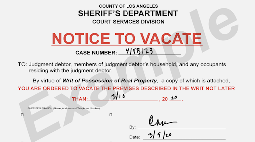 A Notice to Vacate (Fig 4) is a notice from the Sheriff indicating that there has already been a judgment against the tenant (meaning the court has decided that the tenant has lost the case). This document orders the tenant to move out before the deadline that it states (typically 5 days after the notice is posted). The sheriff can come any day after that deadline to evict you and change the locks. If a tenant receives a Notice to Vacate and wants to stay in their home, they need to act quickly to get legal help. Sometimes, if the tenant files the right paperwork and takes all the right steps, the judge will give the tenant more time or allow the case to be re-opened so the tenant can fight the eviction.