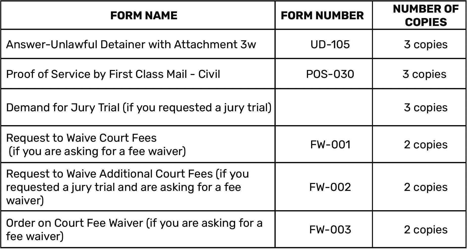 1 copy of the FW-003 (the Order on Court Fee Waiver) - do not sign this